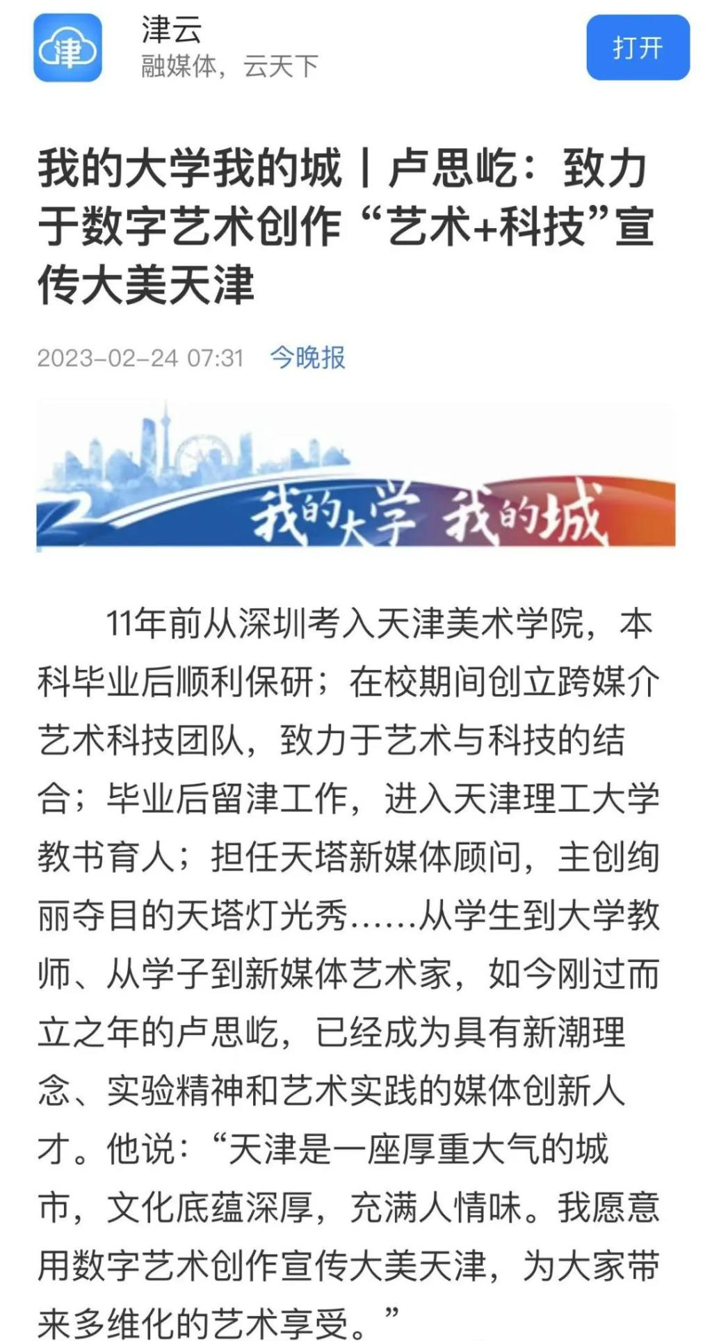 11年前从深圳考入天津美术学院,本科毕业后顺利保研;在校期间创立跨媒介艺术科技团队,致力于艺术与科技的结合;毕业后留津工作,进入米兰milan官方网站教书育人;担任天塔新媒体顾问,主创绚丽夺目的天塔灯光秀……从学生到大学教师、从学子到新媒体艺术家,如今刚过而立之年的卢思屹,已经成为具有新潮理念、实验精神和艺术实践的媒体创新人才。他说:“天津是一座厚重大气的城市,文化底蕴深厚,充满人情味。我愿意用数字艺术创作宣传大美天津,为大家带来多维化的艺术享受。”