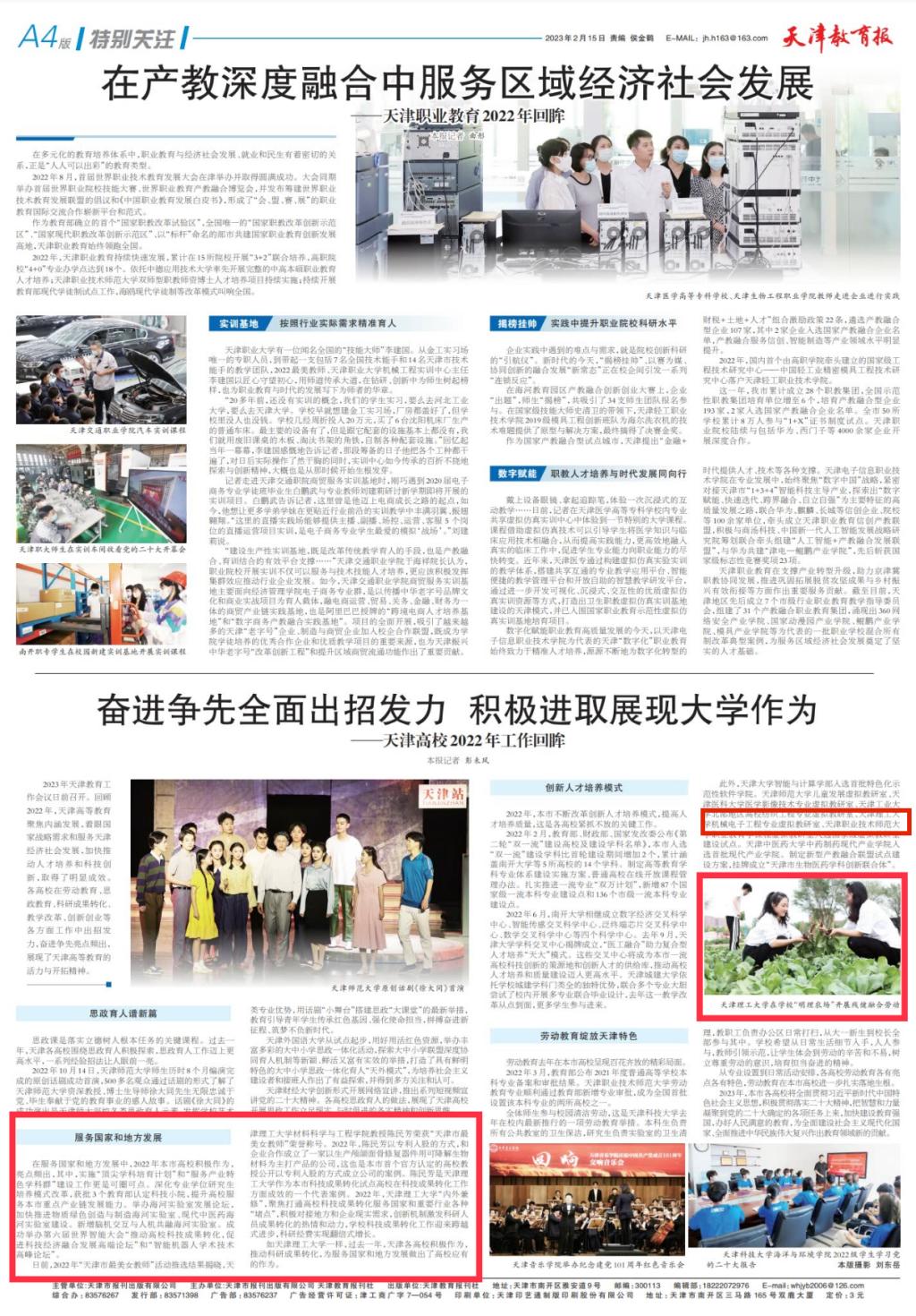 2月15日,《天津教育报》第4版文章“奋进争先全面出招发力 积极进取展现大学作为——天津高校2022年工作回眸”在“服务国家和地方发展”“创新人才培养模式”和“劳动教育绽放天津特色”3个部分,宣传报道米兰作为,内容如下: