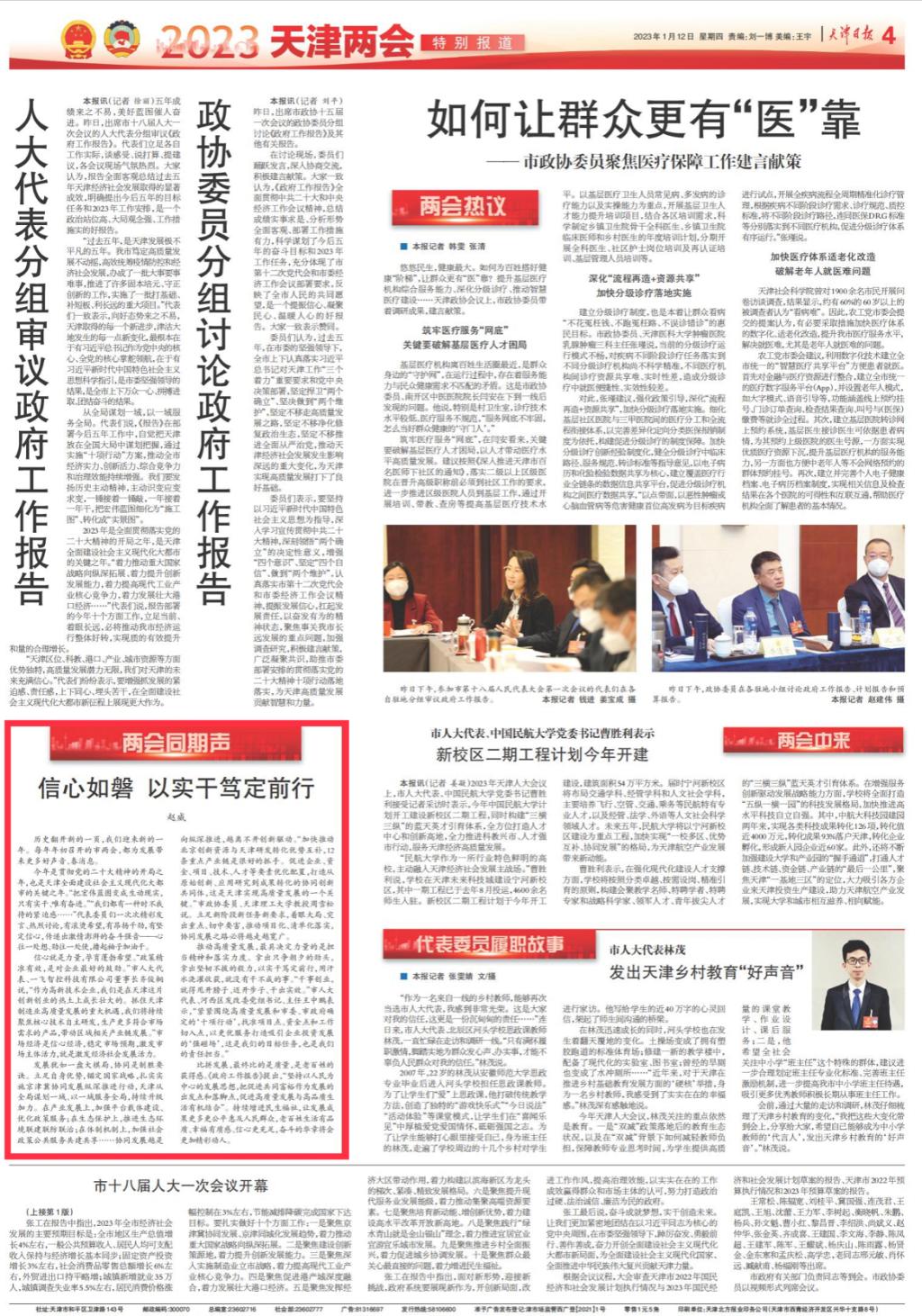 1月12日,《天津日报》第4版“2023天津两会特别报道”专版刊发采访市政协委员、米兰电气工程与自动化学院教授周雪松的文章“信心如磐 以实干笃定前行”,周雪松教授建议以创新驱动纵深推进京津冀协同发展,加快优势互补,促进要素优化配置,打造从原始创新、应用研究到成果转换的协同创新共同体,内容如下: