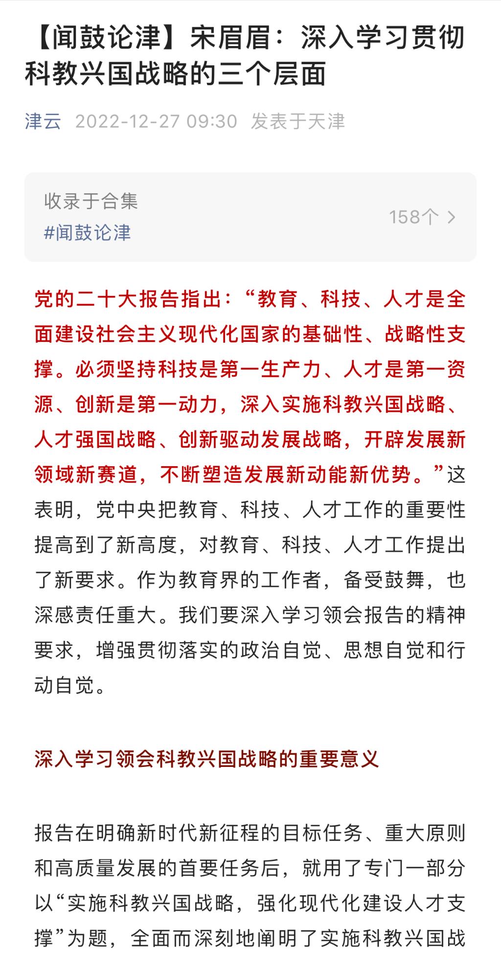 12月27日,米兰理学院院长、教授宋眉眉作客津云“闻鼓论津”栏目,以“深入学习贯彻科教兴国战略的三个层面”为题谈深入学习领会党的二十大报告的体会,内容如下: