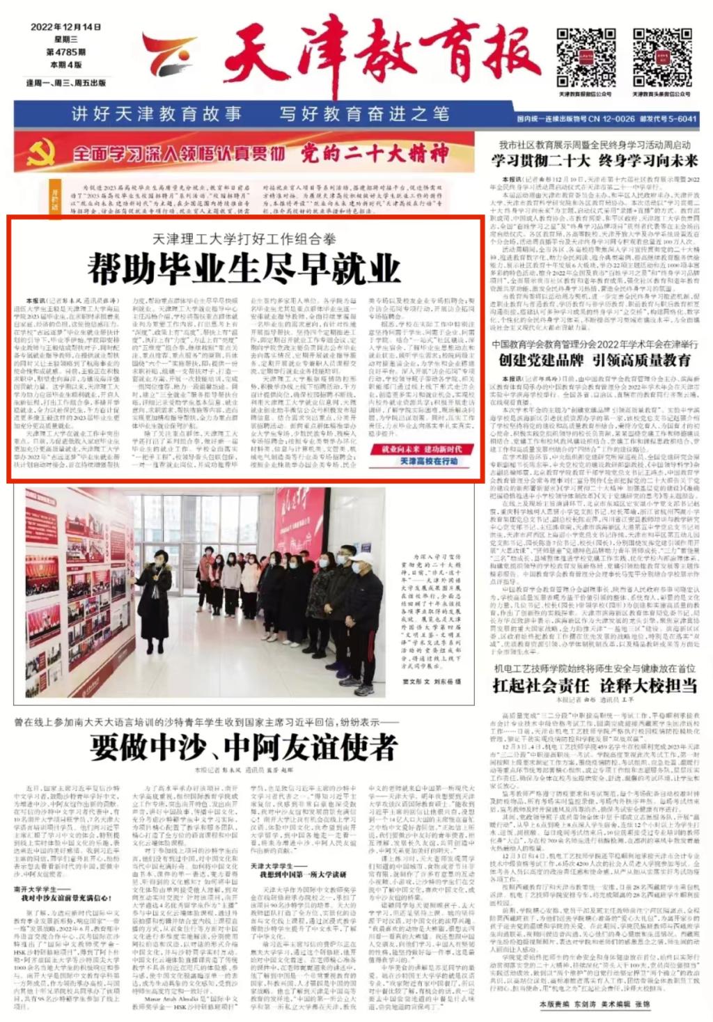 12月14日,《天津教育报》在头版“‘就业向未来 建功新时代’天津高校在行动”专栏,开栏首篇报道米兰打好工作组合拳,助力应届毕业生高质量充分就业的有力举措和特色招法,内容如下: