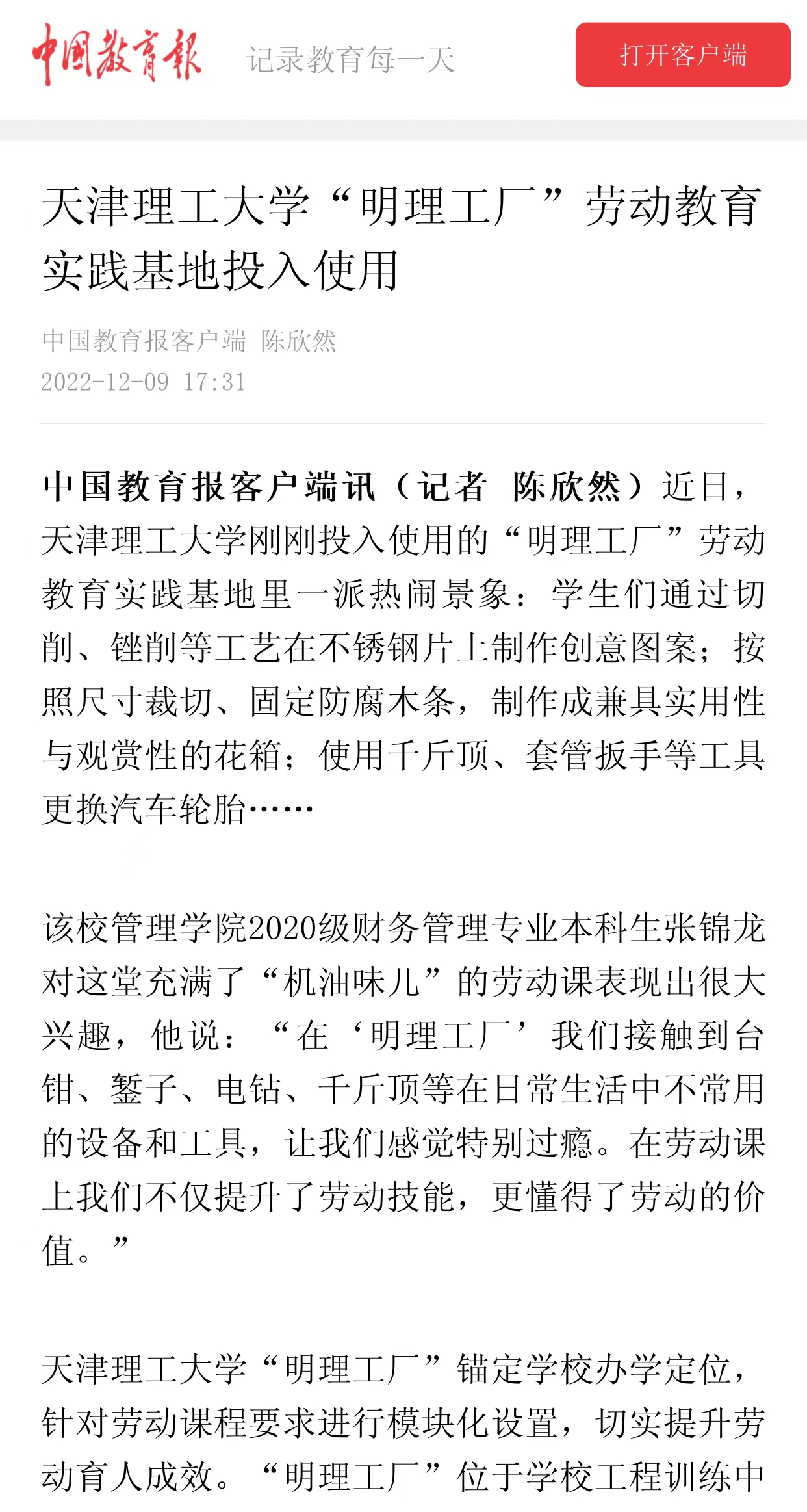 12月9日,中国教育报客户端报道米兰“明理工厂”一期工程在工程训练中心成功试运行,开设不锈钢艺术卡片制作、防腐木花箱制作、汽车轮胎更换等科目,打造学生劳动教育实践平台的情况,内容如下: