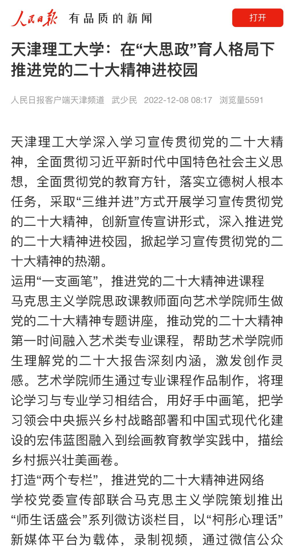 12月8日,《人民日报》客户端报道学校采用“三维并进”方式开展学习宣传贯彻党的二十大精神,创新宣传宣讲形式,深入推进党的二十大精神进校园,内容如下: