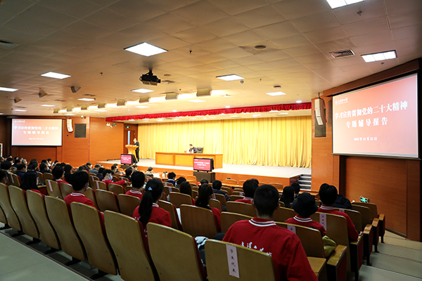 孟祥飞首先畅谈了作为党的二十大代表出席大会并担任大会监票人的切身体会,分享了大会庄严热烈的现场氛围,还分享了中国超级计算机事业的发展历程和来之不易的成果,以及天河超级计算机技术研发的实践应用,取得的每一项成绩、实现的每一步跨越,离不开习近平总书记的关心关怀,这根本在于习近平总书记领航掌舵,在于以习近平同志为核心的党中央坚强领导,在于习近平新时代中国特色社会主义思想的科学指引。在报告会第二部分,孟祥飞结合党的二十大报告,为师生解读了党的二十大主题,过去5年和新时代10年的伟大变革,把握好习近平新时代中国特色社会主义思想的世界观和方法论,开辟马克思主义中国化时代化新境界,中国式现代化的特色和本质,全面建设社会主义现代化国家的目标任务,应对风险挑战,团结奋斗等方面的内容。在报告会第三部分,孟祥飞从“以历史观审视中国式现代化,以时代观审视总体国家安全观,以系统观审视理解科教兴国、人才强国的基础性战略性支撑,以发展观审视信息技术引领新一轮产业革命”四个方面为师生作了深入的解读和交流。在报告会尾声青年学生争相举手提问,围绕科技创新等话题与孟祥飞开展互动交流,孟祥飞详细解答了学生的提问,现场气氛热烈。孟祥飞的报告深入浅出,既有理论高度又有现实价值,鲜活的事例和生动的讲解,引发了师生强烈共鸣,为师生深入学习领会党的二十大精神提供了有益指导和帮助。