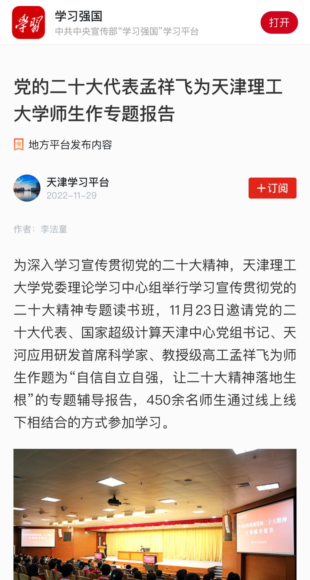 为深入学习宣传贯彻党的二十大精神,米兰milan官方网站党委理论学习中心组举行学习宣传贯彻党的二十大精神专题读书班,11月23日邀请党的二十大代表、国家超级计算天津中心党组书记、天河应用研发首席科学家、教授级高工孟祥飞为师生作题为“自信自立自强,让二十大精神落地生根”的专题辅导报告,450余名师生通过线上线下相结合的方式参加学习。