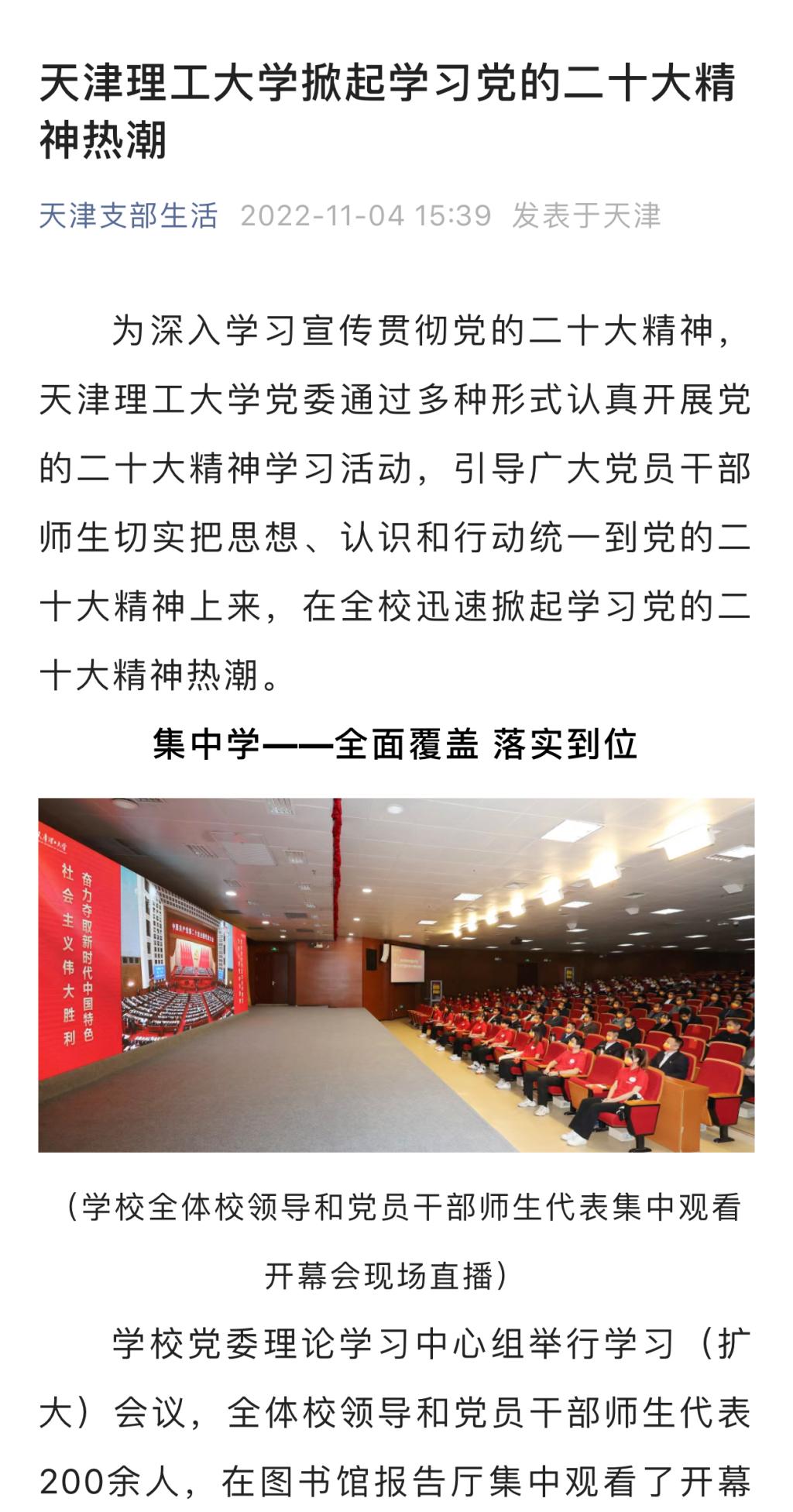 11月4日,天津支部生活官方微信公众号报道校党委通过多种形式认真开展党的二十大学习活动,引导广大党员干部师生切实把思想、认识和行动统一到党的二十大精神上来,在全校迅速掀起学习党的二十大精神热潮,内容如下: