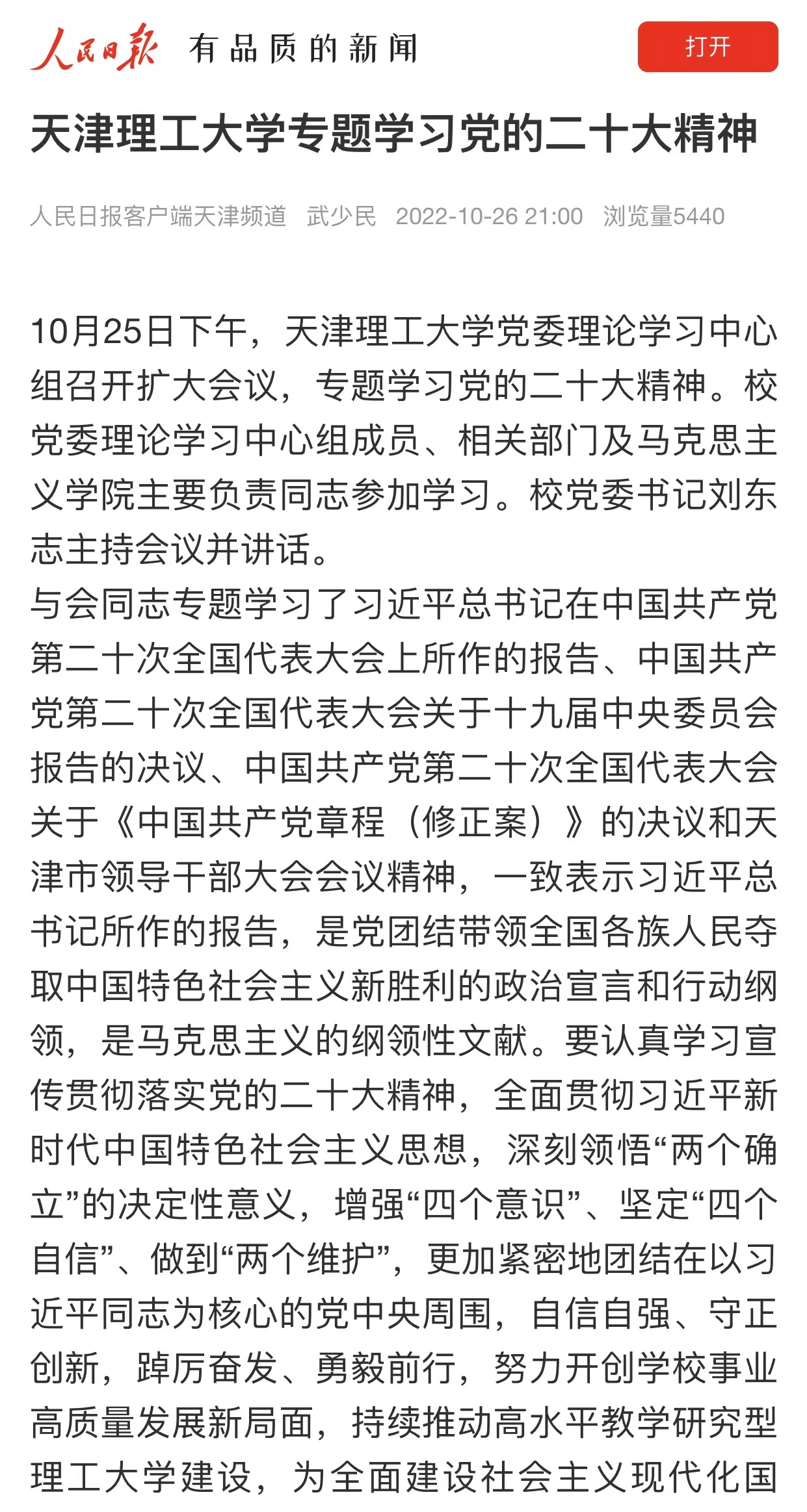 10月26日,人民日报客户端报道校党委理论学习中心组召开扩大会议,专题学习党的二十大精神情况,内容如下: