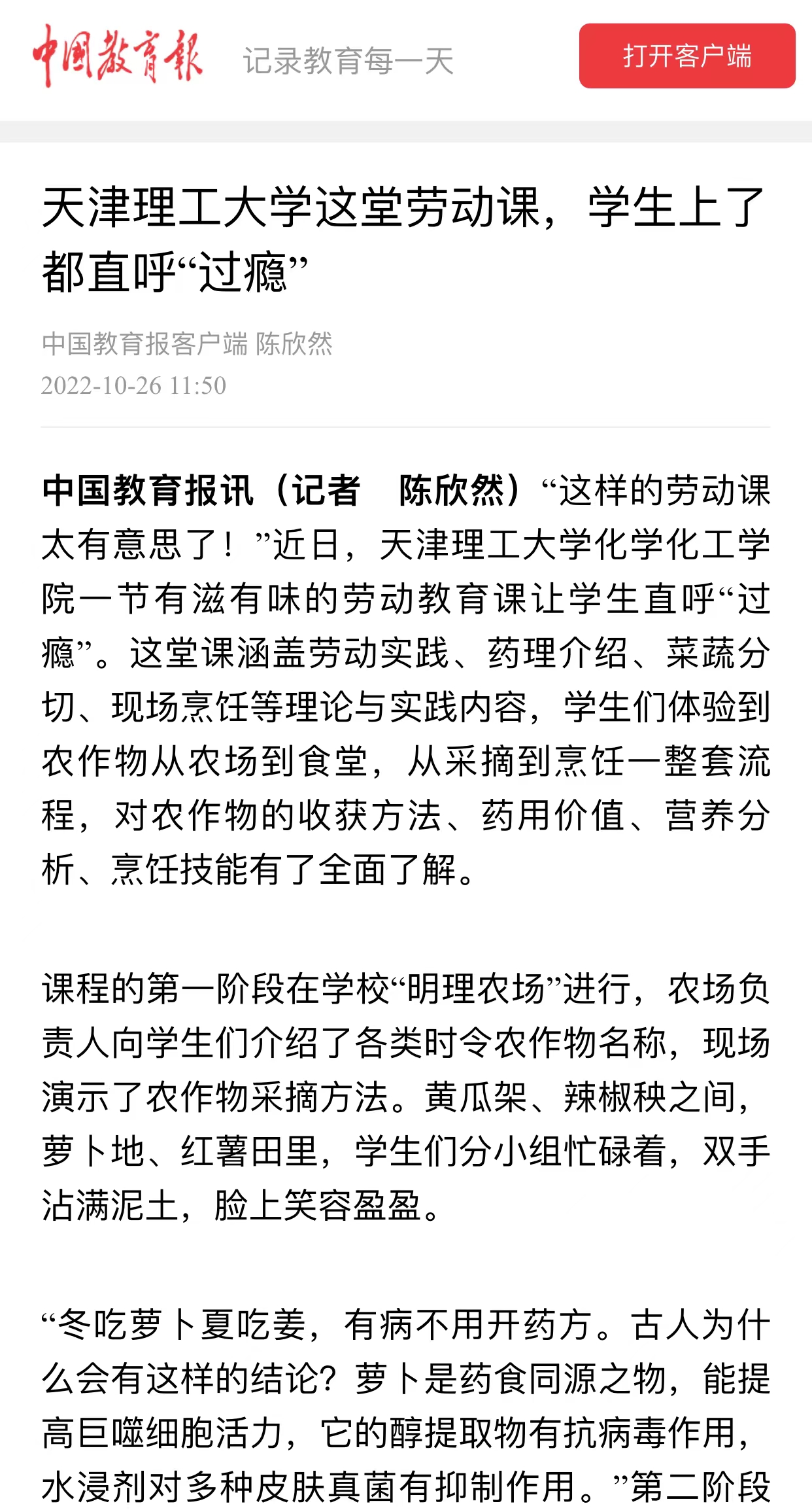 10月24日,《中国教育报》、中国教育新闻网报道米兰化学化工学院创新劳动教育课,课程涵盖劳动实践、药理介绍、菜蔬分切、现场烹饪等理论与实践内容,学生们体验到农作物从农场到食堂,从采摘到烹饪一整套流程,对农作物的收获方法、药用价值、营养分析、烹饪技能有了全面了解,内容如下: