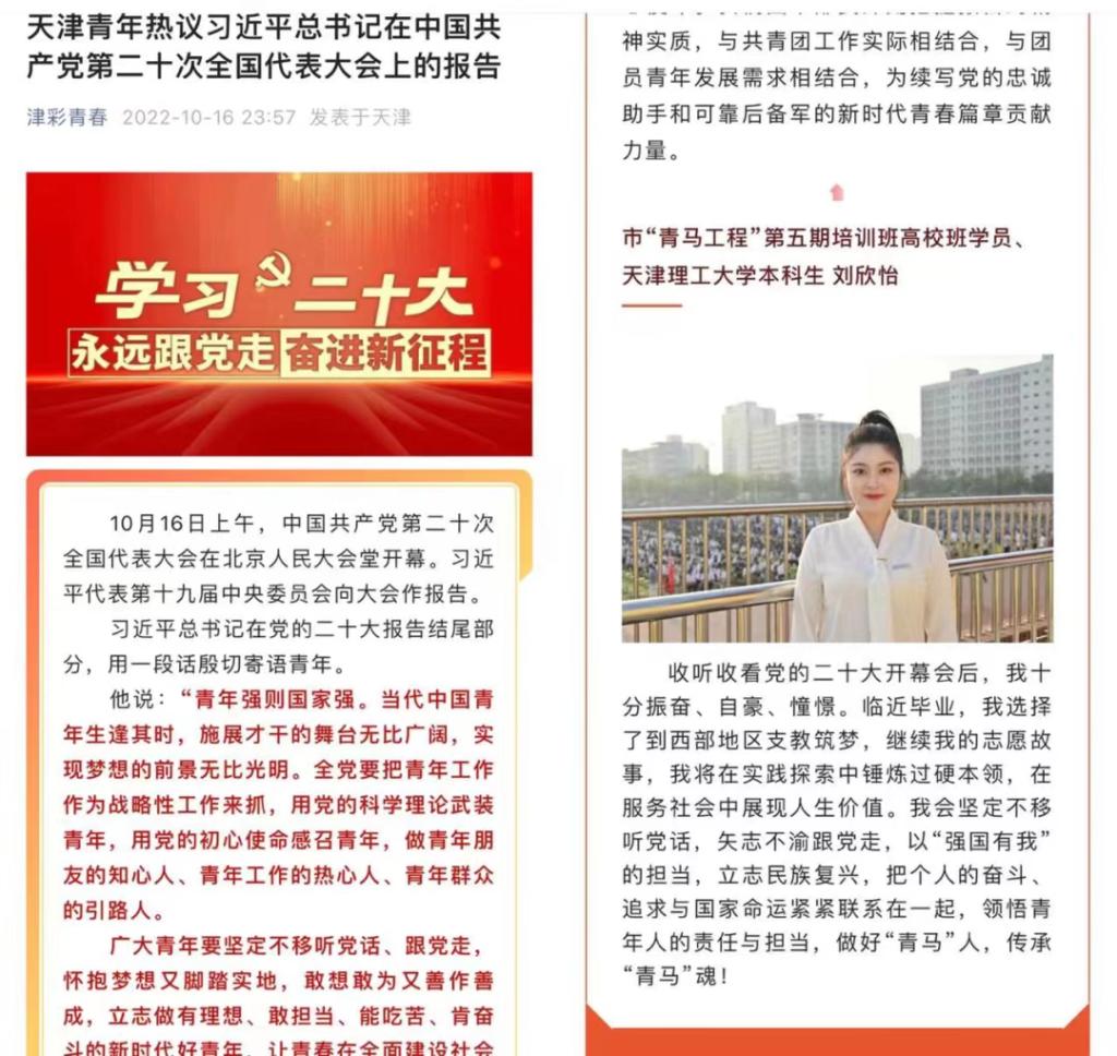 10月16日,津彩青春报道市“青马工程”第五期培训班高校班学员、米兰语言文化学院本科生刘欣怡热议党的二十大报告情况,内容如下: