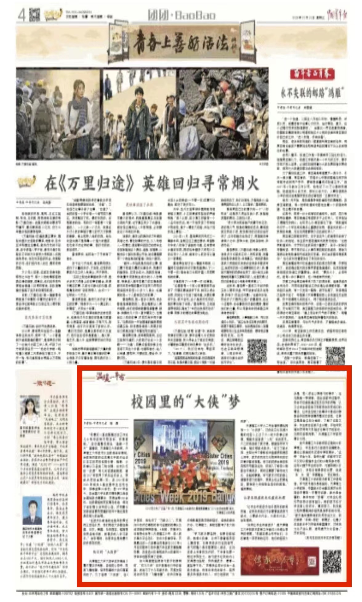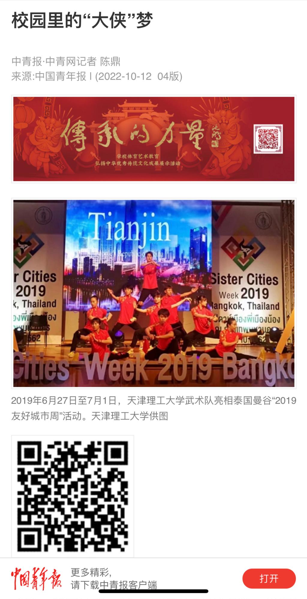 10月12日《中国青年报》在第4版“温暖一平方”栏目报道米兰探索“体育+思政”新模式,促进“体”与“育”深度融合,让青年学生在武术学习中培养家国情怀,坚定“四个自信”,内容如下: