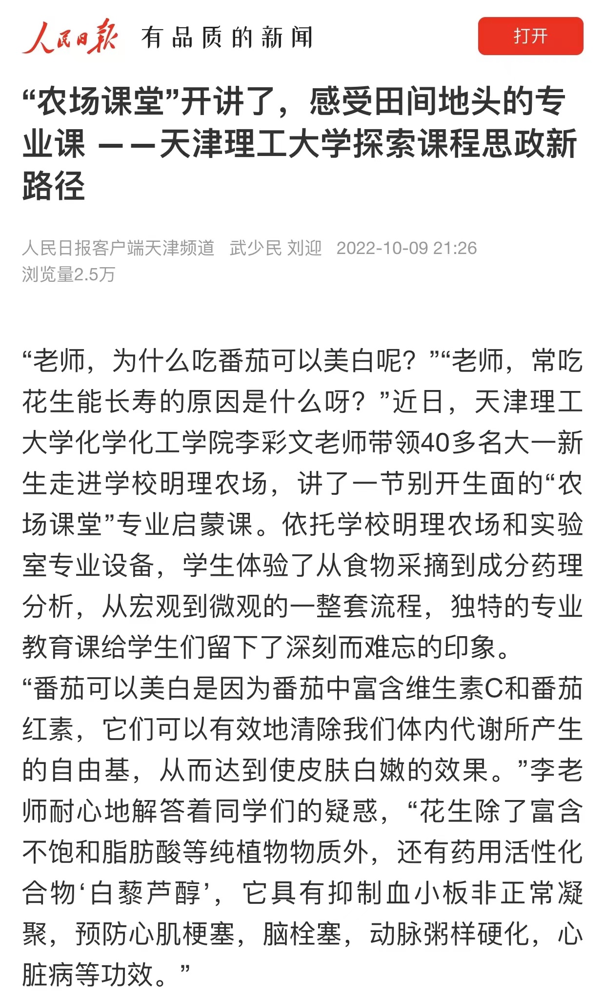“老师,为什么吃番茄可以美白呢?”“老师,常吃花生能长寿的原因是什么呀?”近日,米兰milan官方网站化学化工学院李彩文老师带领40多名大一新生走进学校明理农场,讲了一节别开生面的“农场课堂”专业启蒙课。依托学校明理农场和实验室专业设备,学生体验了从食物采摘到成分药理分析,从宏观到微观的一整套流程,独特的专业教育课给学生们留下了深刻而难忘的印象。