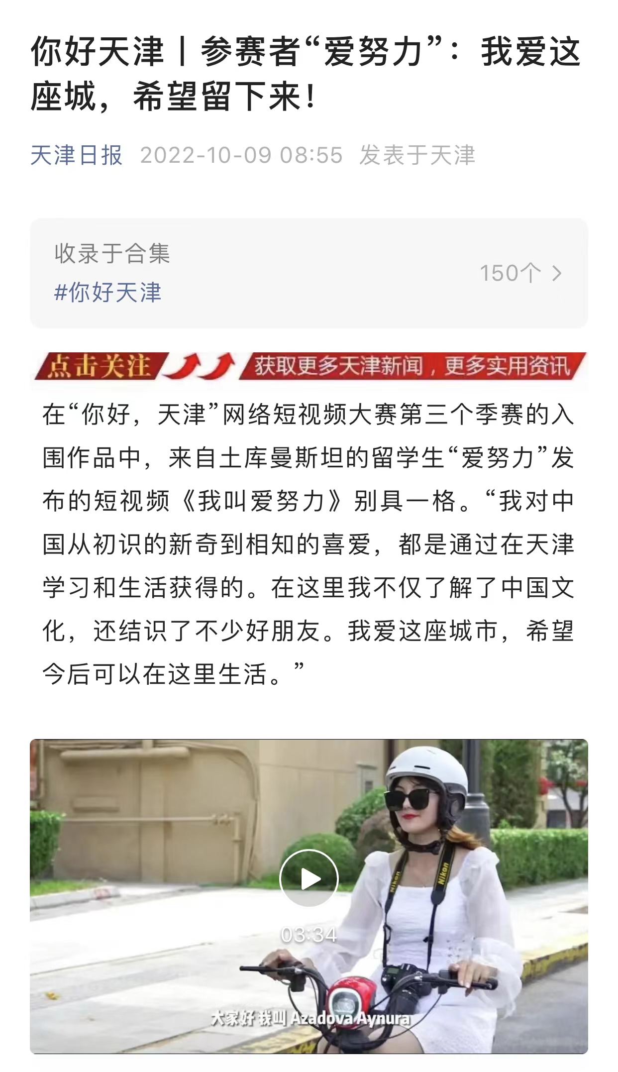在“你好,天津”网络短视频大赛第三个季赛的入围作品中,来自土库曼斯坦的留学生“爱努力”发布的短视频《我叫爱努力》别具一格。“我对中国从初识的新奇到相知的喜爱,都是通过在天津学习和生活获得的。在这里我不仅了解了中国文化,还结识了不少好朋友。我爱这座城市,希望今后可以在这里生活。”