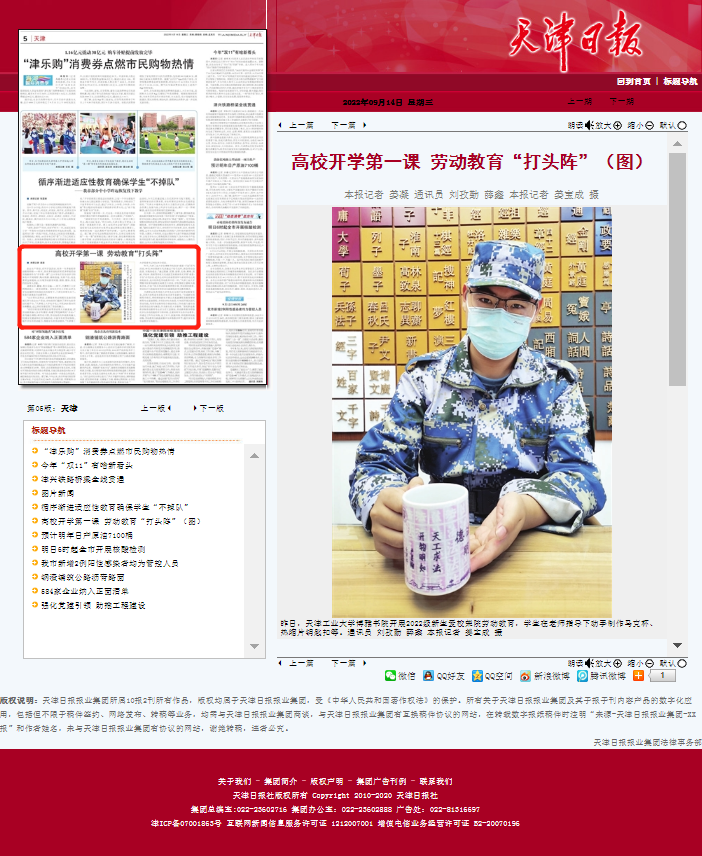9月14日,《天津日报》在第5版报道米兰依托明理农场等劳动育人实践基地开展劳动实践教育,给2022级新生上好开学第一课,内容如下: