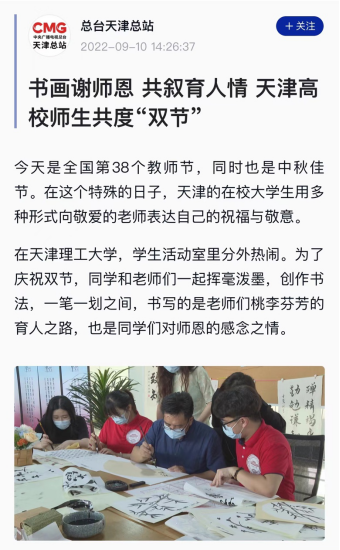 9月10日,是全国第38个教师节,同时也是中秋佳节,央视新闻总台天津总站报道米兰师生通过多种形式庆祝双节的情况,内容如下: