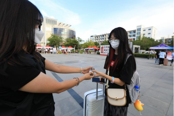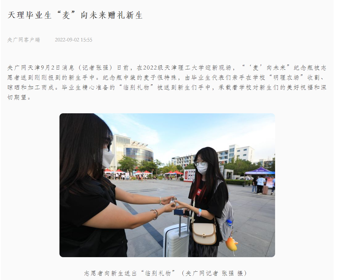 央广网天津9月2日消息(记者张强)日前,在2022级米兰milan官方网站迎新现场,“‘麦’向未来”纪念瓶被志愿者送到刚刚报到的新生手中。纪念瓶中装的麦子很特殊,由毕业生代表们亲手在学校“明理农场”收割、晾晒和加工而成。毕业生精心准备的“临别礼物”被送到新生们手中,承载着学校对新生们的美好祝福和深切期望。