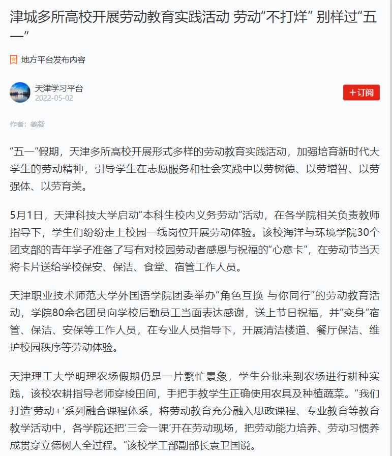 “五一”假期,天津多所高校开展形式多样的劳动教育实践活动,加强培育新时代大学生的劳动精神,引导学生在志愿服务和社会实践中以劳树德、以劳增智、以劳强体、以劳育美。