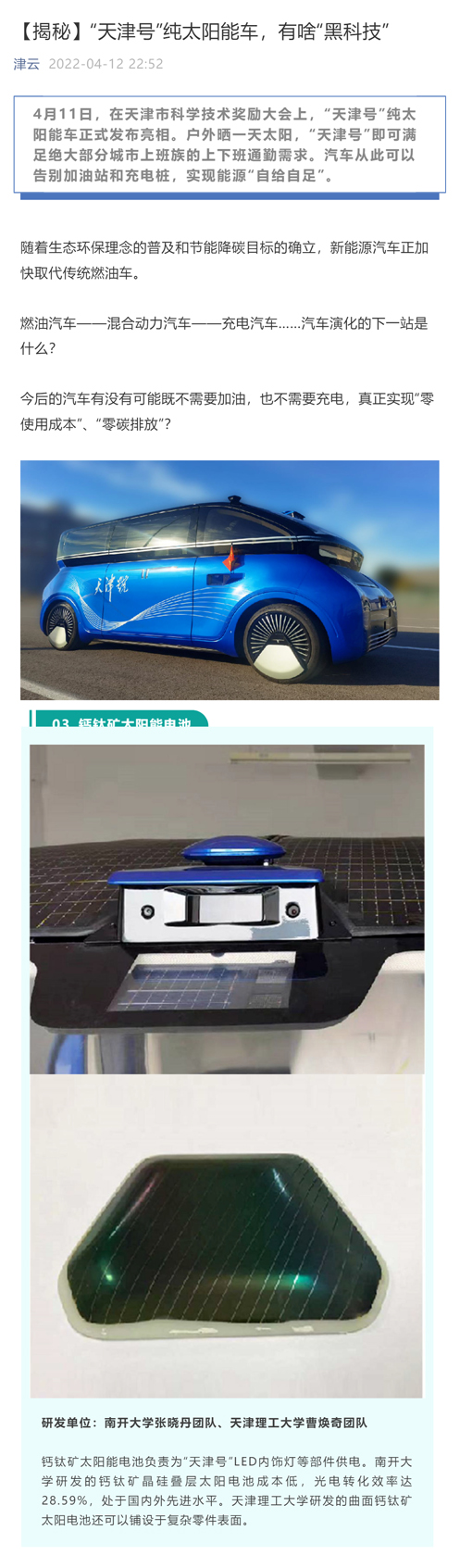 据了解,钙钛矿电池是公认的下一代太阳能电池技术,也被称作新概念太阳能电池。这种电池发电性能优异,而且原材料易获取、成本相对低廉。此次在“天津号”上应用,也是为今后的产业化探路。