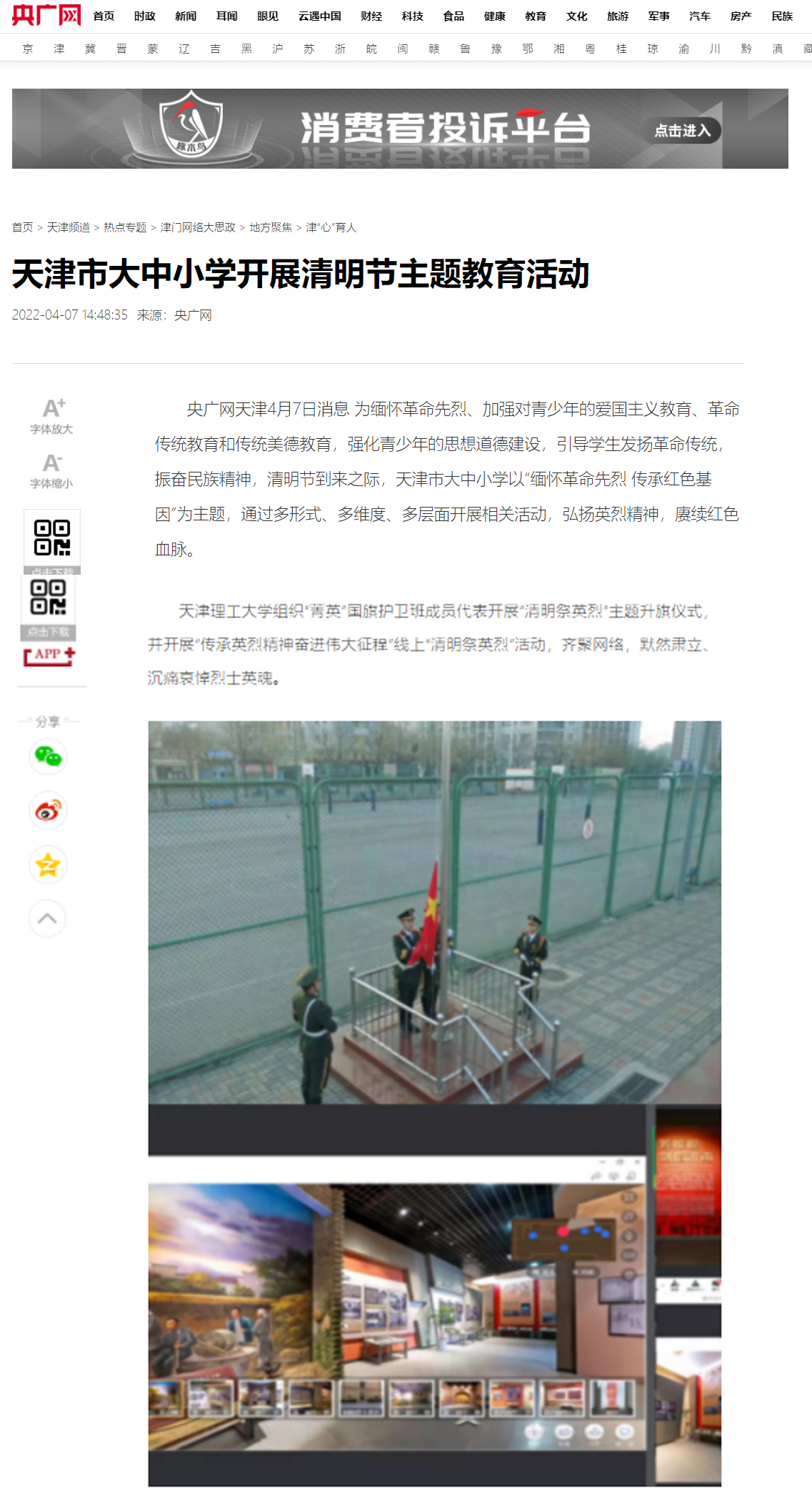 央广网天津4月7日消息 为缅怀革命先烈、加强对青少年的爱国主义教育、革命传统教育和传统美德教育,强化青少年的思想道德建设,引导学生发扬革命传统,振奋民族精神,清明节到来之际,天津市大中小学以“缅怀革命先烈 传承红色基因”为主题,通过多形式、多维度、多层面开展相关活动,弘扬英烈精神,赓续红色血脉。