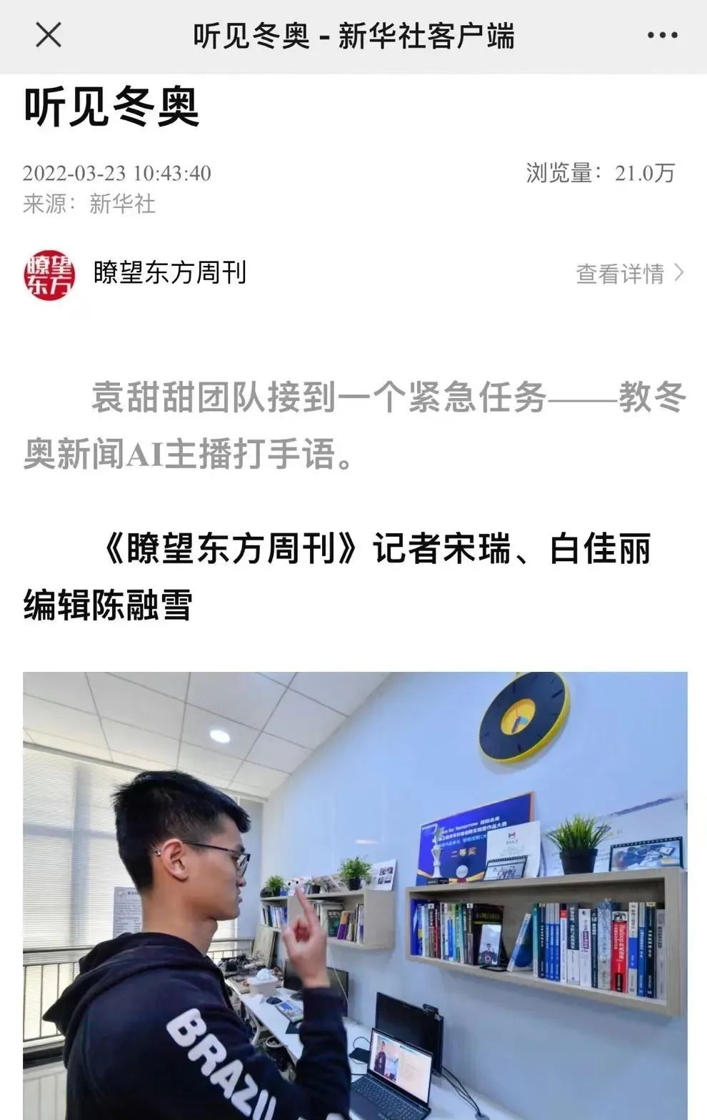 今年22岁的王晓阳,是聋人工学院大三的学生。作为一名听障学生,他既参与了冬奥新闻AI主播“学习”手语的全过程,也是冬奥赛事的忠实“听众”,每天准时上线,“盯着”AI主播的手语播报。
