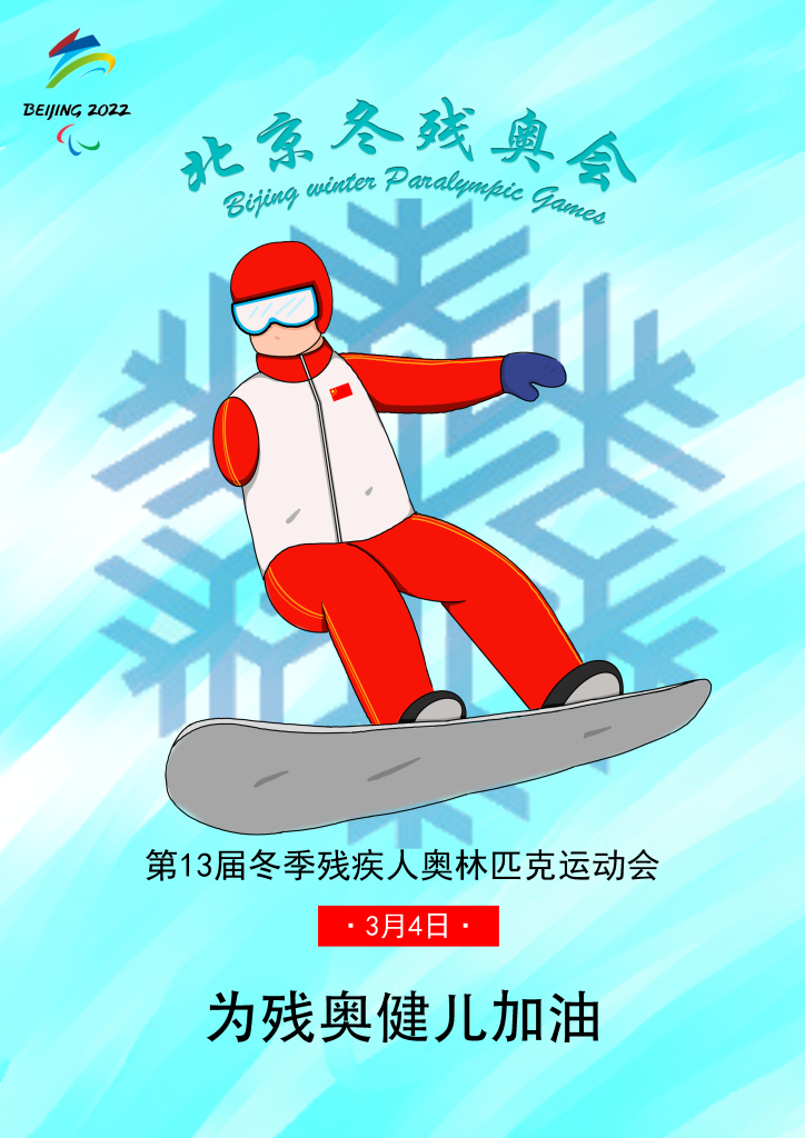 设计理念:海报蓝红白相间,是冬季和雪容融特有的色调。滑板采用冬奥会logo色彩,象征运动员以不屈的毅力、蓬勃的朝气和参与冰雪运动的热情,在冬残奥会赛场上释放生命的激情。