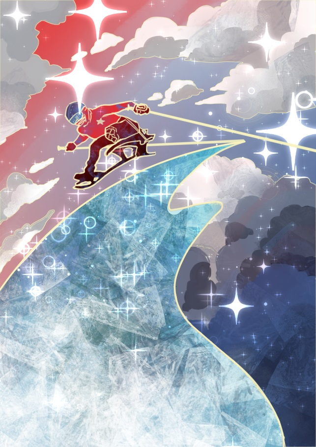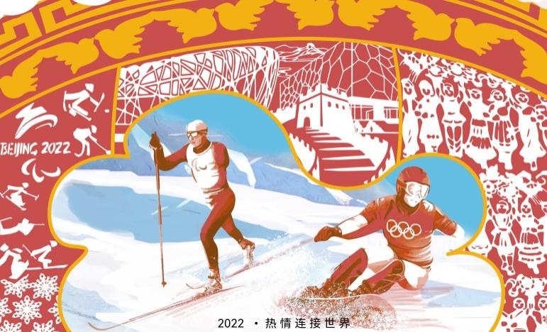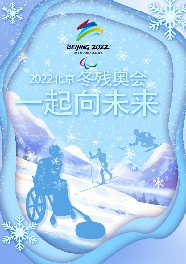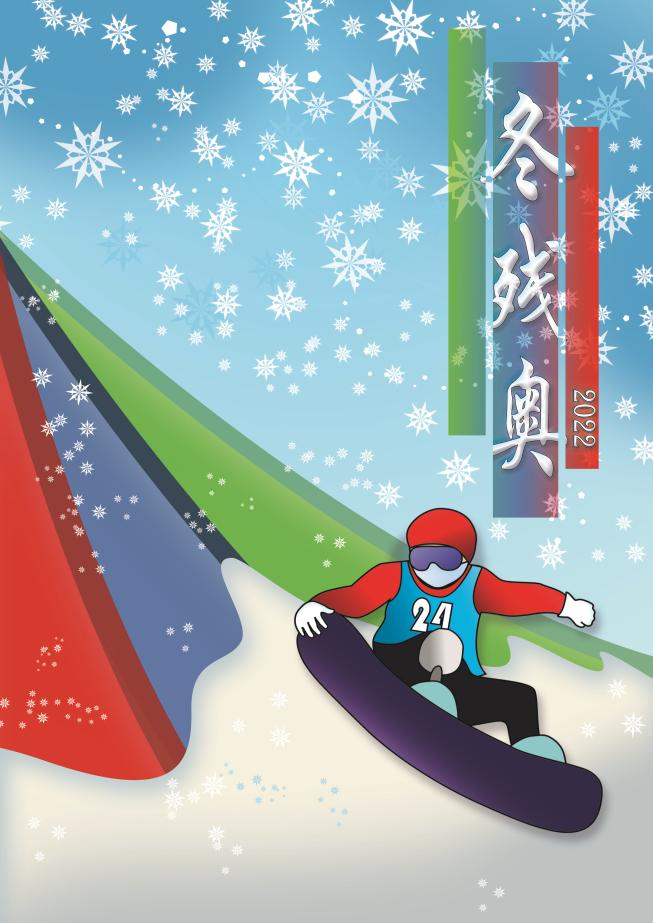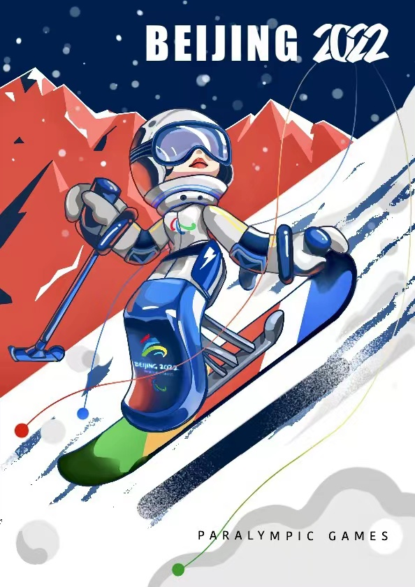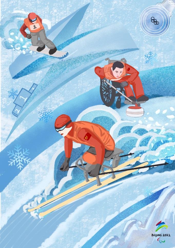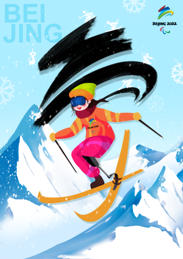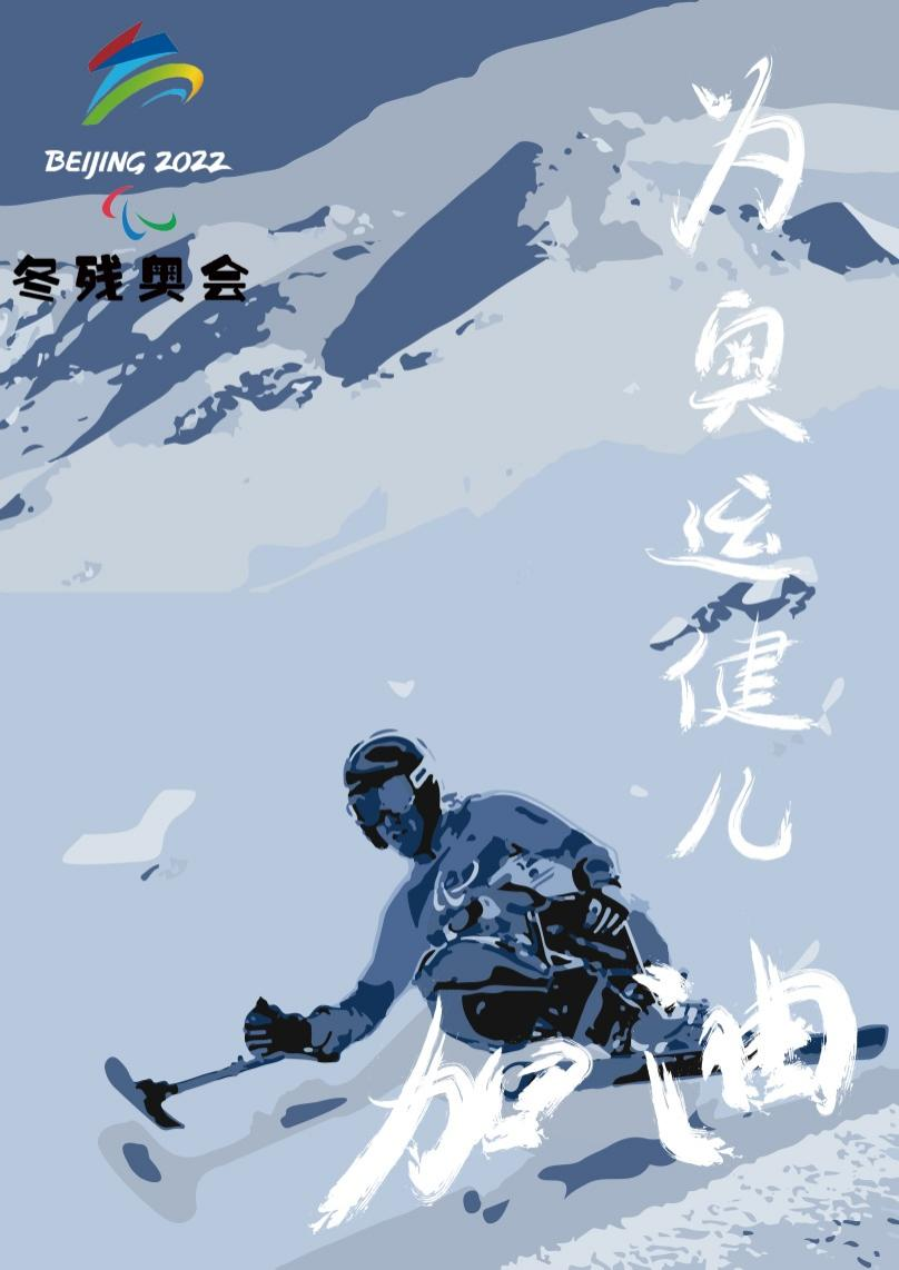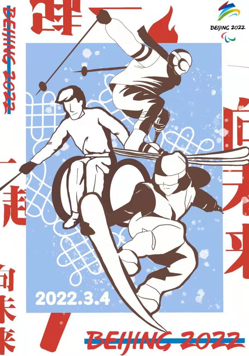 设计理念:以蓝白相间的冬奥会大雪花火炬作为背景,三个残奥运动员在努力拼搏,展现了年轻一代蓬勃向上的朝气和参与冰雪运动的热情。