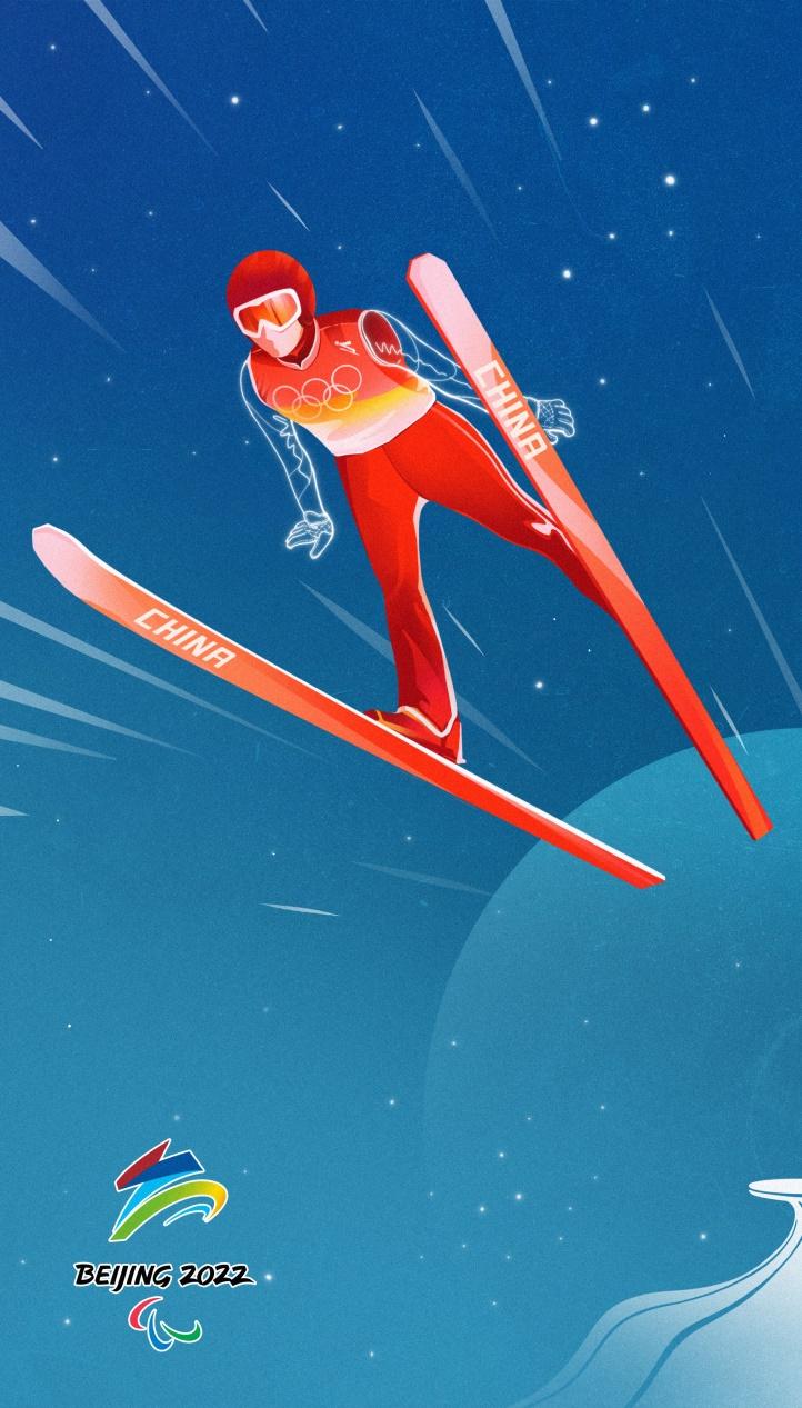 设计理念:以冰天雪地的色调为主,背景是蓝天白云,代表运动员一飞冲天的梦想。运动员身后的雪山延展而来,展现了冬残奥会的场地和祖国的大好河山。