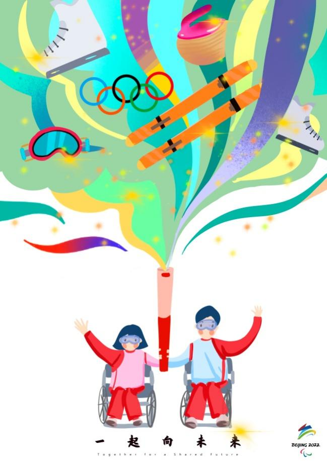 设计理念:海报的主题是“一起向未来”。图中两个坐轮椅的残疾运动员,共同举起火炬,点亮冬奥之光,冬奥的冰丝带夹着冬残奥会各种运动项目物品,代表将照亮全人类追求团结、和平、友谊的前行之路。