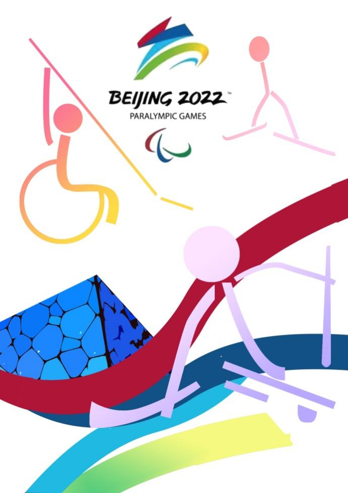 设计理念:选用纯白色背景,由渐变色的火柴人、水立方建筑、四条缎带、残奥会会徽组合而成。其中渐变色火柴人分别代表滑雪、冰壶、冰球三项运动,缎带上的颜色分别对应残奥会会徽上的颜色,寓意运动员能够在残奥会上大放异彩,书写残奥会上浓重色彩。