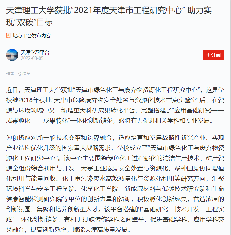 为积极应对新一轮技术变革和跨界融合,适应培育和发展战略性新兴产业、实现产业结构优化升级的国家重大战略需求,学校成立了“天津市绿色化工与废弃物资源化工程研究中心”。该中心主要围绕绿色化工过程强化的清洁生产技术、矿产资源全组份综合利用与开发、大宗工业危废安全处置与资源化、多种固废协同增值化利用与能量回收、化工重污染废水高效减量化与资源化利用等研究方向,汇聚环境科学与安全工程学院、化学化工学院、新能源材料与低碳技术研究院和生命健康智能检测研究院等单位的创新力量和资源,积极孵化创新成果,营造浓厚的创新氛围,集聚和培养创新型人才。该平台搭建的“基础研究—技术开发—工程实践”一体化创新链条,有利于打破传统学科之间壁垒,促进基础学科、应用学科交叉融合,提高创新效率,赋能天津高质量发展。