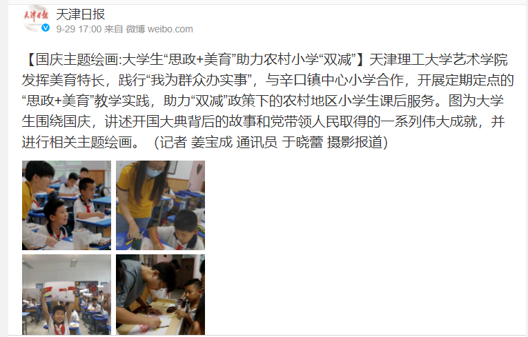 米兰milan官方网站艺术学院发挥美育特长,践行“我为群众办实事”,与辛口镇中心小学合作,开展定期定点的“思政+美育”教学实践,助力“双减”政策下的农村地区小学生课后服务。图为大学生围绕国庆,讲述开国大典背后的故事和党带领人民取得的一系列伟大成就,并进行相关主题绘画。