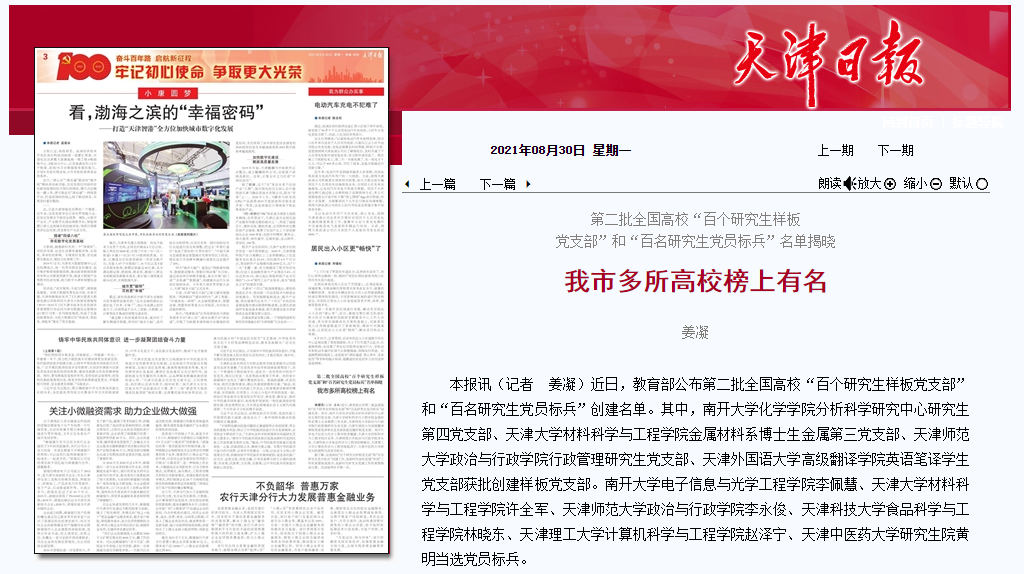 近日,教育部公布第二批全国高校“百个研究生样板党支部”和“百名研究生党员标兵”创建名单。其中,南开大学化学学院分析科学研究中心研究生第四党支部、天津大学材料科学与工程学院金属材料系博士生金属第三党支部、天津师范大学政治与行政学院行政管理研究生党支部、天津外国语大学高级翻译学院英语笔译学生党支部获批创建样板党支部。南开大学电子信息与光学工程学院李佩慧、天津大学材料科学与工程学院许全军、天津师范大学政治与行政学院李永俊、天津科技大学食品科学与工程学院林晓东、米兰milan官方网站计算机科学与工程学院赵泽宁、天津中医药大学研究生院黄明当选党员标兵。