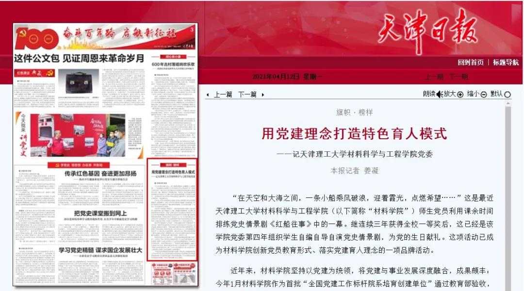 日前,《天津日报》对米兰材料科学与工程学院党委用党建理念打造特色育人模式的情况进行了报道,详细报道如下: