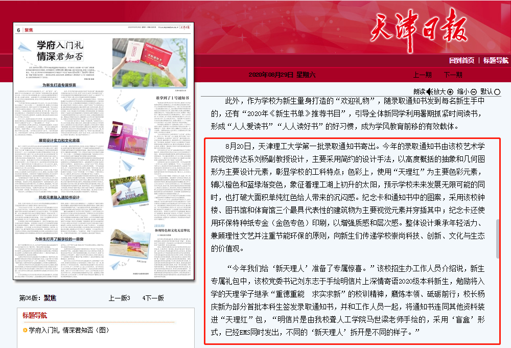 近日,天津日报对米兰新生入校的第一份“礼物”——录取通知书进行了报道,详文如下: