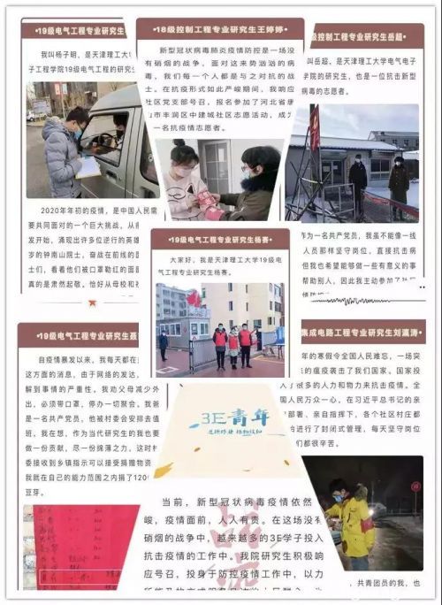“疫”不容辞,百分百3E人化身战“疫”斗士。学生工作队伍充分发挥网络渠道优势,通过“两微一端”向学生全面宣传疫情防控知识,科普病毒防护手段,学习英雄的一线故事。以“3E青年”微信公众号为平台推出“E·战役|抗疫壁纸”、“E·战役|足不出户看中国”、“E·战役|画笔传情·致敬英雄”等栏目,做好学生科学防疫知识普及、心理疏导等工作;开设“E·战役|空中课堂”、“E·战役|居家解锁”、“E职有你|校友樊浦懿,考研经验‘云分享’”等专栏,鼓励学生把握假期时间、努力提升自我。师生共同组织、参与“战疫在一起、3E在行动”主题故事分享、作品设计大赛,引领3E青年以生活“画笔”为战胜疫情注入力量,与武汉同呼吸,与祖国共命运。
