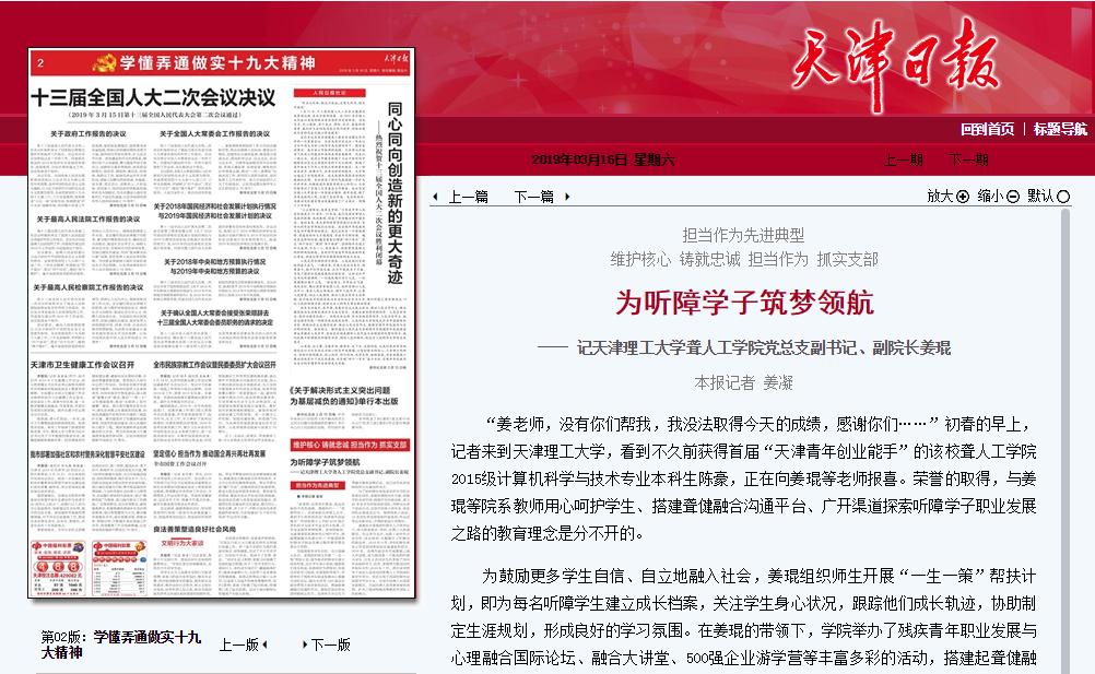 “姜老师,没有你们帮我,我没法取得今天的成绩,感谢你们……”初春的早上,记者来到米兰milan官方网站,看到不久前获得首届“天津青年创业能手”的该校聋人工学院2015级计算机科学与技术专业本科生陈豪,正在向姜琨等老师报喜。荣誉的取得,与姜琨等院系教师用心呵护学生、搭建聋健融合沟通平台、广开渠道探索听障学子职业发展之路的教育理念是分不开的。